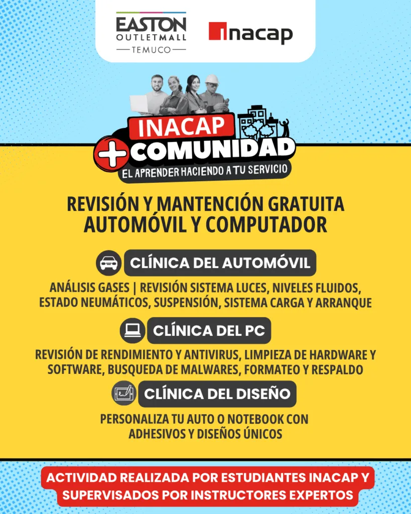 Con el propósito de acercar el conocimiento técnico y profesional a las personas, INACAP Sede Temuco, junto a Easton Outlet Mall, realizarán este fin de semana la jornada “INACAP + Comunidad: El aprender haciendo a tu servicio”, una instancia gratuita y abierta al público que ofrecerá atención básica para automóviles y equipos computacionales.